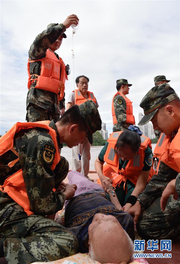 8月18日,在乐山市市中区,救援人员安抚被困群众。 8月17日晚,受持续强降雨影响,四川青衣江现百年一遇洪水。8月18日中午,洪峰过境四川省乐山市,一千多名群众被困市中区凤洲岛上,救援人员紧急前往现场转移被困群众,截至18时已安全转移513人。 新华社记者 胥冰洁 摄