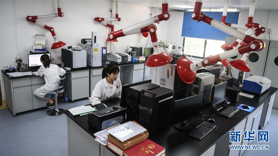 8月18日,在广西柳州市融安县,广西仙草堂制药有限责任公司员工在实验室做检测。 时下,广西柳州市融安县3万亩青蒿进入收获季。当地群众抓紧时间抢收青蒿,生产厂家开足马力提取青蒿素,供应国内外市场。 新华社记者 张爱林 摄