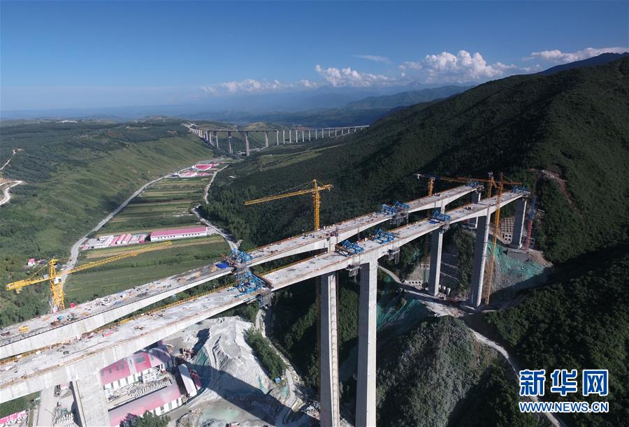 这是双达公路卧龙沟3号特大桥建设现场(8月18日摄,无人机照片)。 甘肃临夏双城至达里加(甘青界)公路工程开工以来,建设者克服海拔高、地质结构复杂等因素影响,稳步推进施工。据了解,双达公路是甘肃省重大建设项目,是甘肃省公路网规划的甘肃临夏至青海循化公路的重要组成部分,采用双向4车道高速公路标准,设计时速80公里,预计2020年底建成通车。项目将在完善甘青两省公路网络,促进沿线资源开发及社会经济发展,加快两省经济文化交流等方面发挥重要作用。 新华社发(史有东 摄)