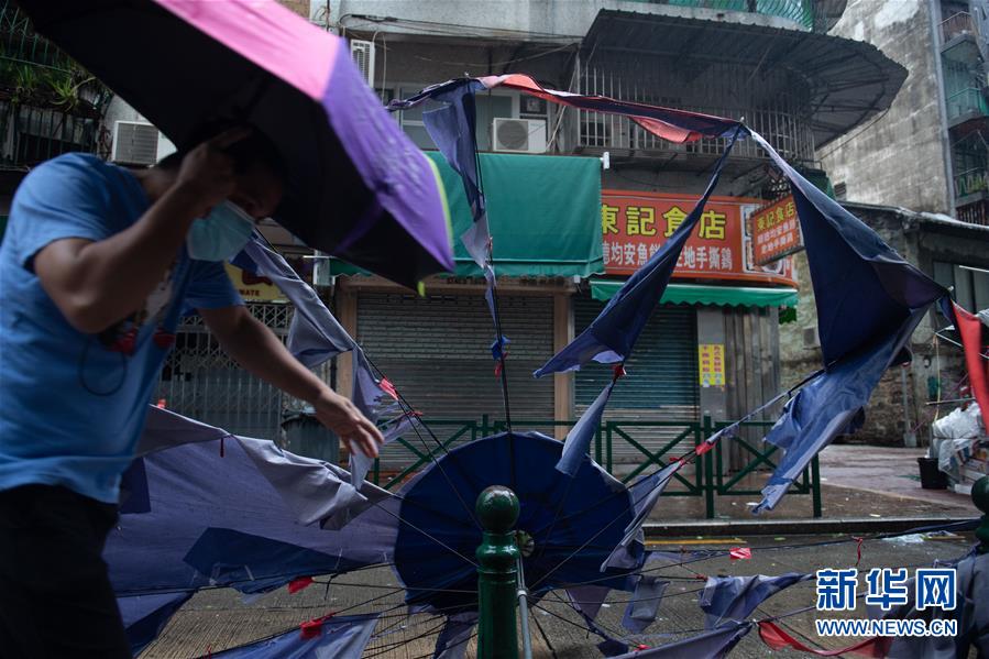 8月19日,一名市民在澳门下环街上行走。 台风“海高斯”袭击珠海、澳门沿海地区,澳门特区政府地球物理暨气象局8月19日5时宣布改发十号风球,5时30分发出风暴潮红色预警。 新华社记者 张金加 摄