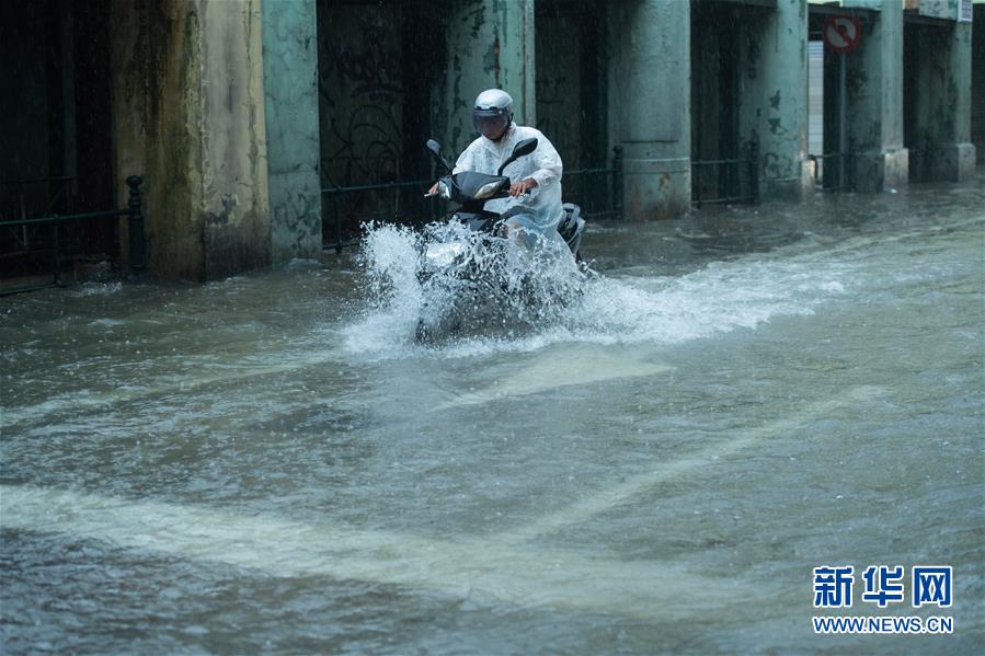8月19日,一辆摩托车驶过积水的澳门新马路。 台风“海高斯”袭击珠海、澳门沿海地区,澳门特区政府地球物理暨气象局8月19日5时宣布改发十号风球,5时30分发出风暴潮红色预警。 新华社记者 张金加 摄