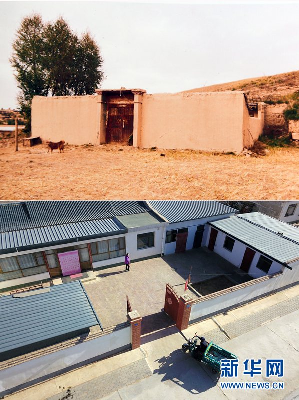 这是一张拼版照片。上图为李应川搬迁前房屋旧貌(翻拍资料照片);下图为2020年3月10日拍摄的李应川搬迁入住的富民新村住房(无人机照片)。新华社记者 范培珅 摄