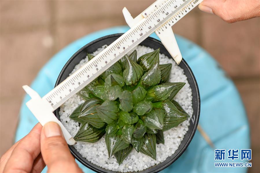 8月19日,种植项目负责人冯存纺在灯塔镇碾山村大棚内测量多肉植物直径。 新华社记者 张楠 摄