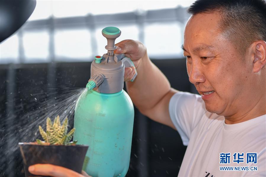 8月19日,种植项目负责人冯存纺在灯塔镇碾山村大棚内给多肉植物喷水。 新华社记者 张楠 摄