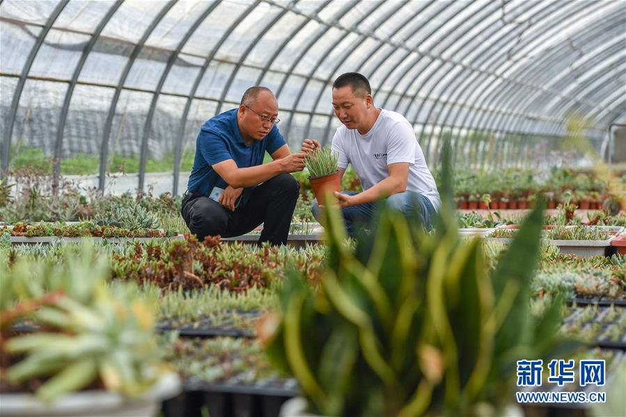 8月19日,灯塔镇碾山村驻村第一书记王金波(左)和种植项目负责人冯存纺在大棚内查看多肉植物长势。 新华社记者 张楠 摄