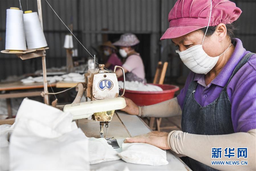 工人在广西金秀县一家瑶药加工厂里缝制药包(7月10日摄)。新华社记者 曹祎铭 摄