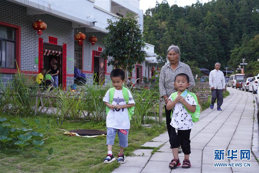 在广西金秀镇六段村的易地扶贫搬迁安置点“拉珈秘境”,家长接孩子放学回家(7月21日摄)。新华社记者 杨驰 摄