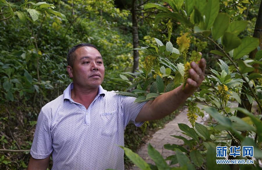 在金秀县共同种养专业合作社,创业致富带头人赵成品在检查黄花倒水莲长势(7月21日摄)。新华社记者 杨驰 摄
