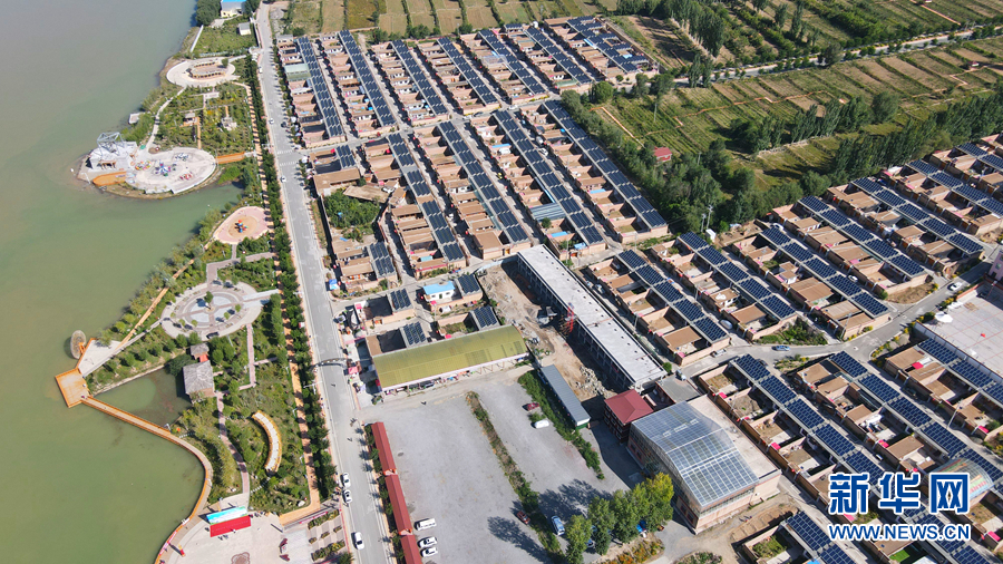 从高处俯瞰,屋顶上一片片光伏发电板排列整齐。新华网 卡娅梅朵摄