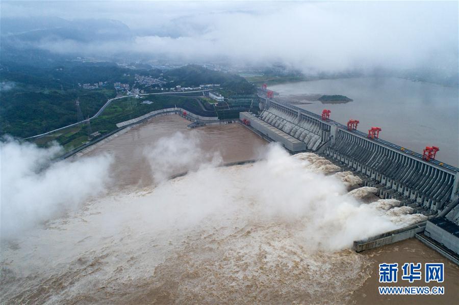 8月20日拍摄的长江三峡水利枢纽工程开启泄洪深孔泄洪的情景(无人机照片)。 8月20日8时,“长江2020年第5号洪水”洪峰抵达三峡水利枢纽,入库流量高达75000立方米每秒,这是三峡水利枢纽自2003年建库以来遭遇的最大洪峰。 新华社发(王罡 摄)