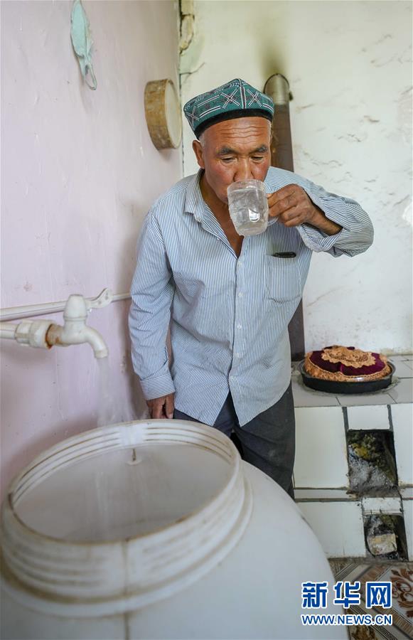 在伽师县英买里乡阿亚克兰干村村民克里木·萨依木家厨房,克里木·萨依木直接饮用水管里流出的放心水(6月9日摄)。 新华社记者 赵戈 摄