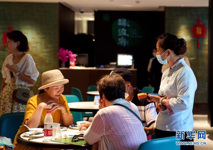 8月20日,在上海豫园的老字号绿波廊,服务员为顾客点单。 新华社记者 刘颖 摄