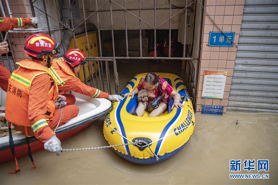 8月19日,在重庆市合川区钓鱼城街道,消防救援人员救援未及时撤离的群众。 新华社记者 黄伟 摄
