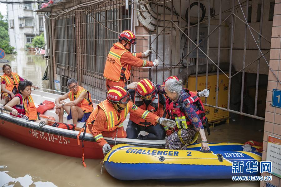8月19日,在重庆市合川区钓鱼城街道,消防救援人员救援未及时撤离的群众。 新华社记者 黄伟 摄