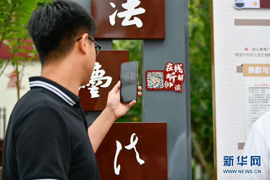 8月20日,在天津市津南区海河故道公园民法典主题长廊,市民用手机扫码体验主题长廊内的在线电子解读功能。 当日,由天津市津南区人民法院设计的民法典主题长廊在津南区海河故道公园投入使用,助力普及民法典相关内容。民法典主题长廊长约百米,设置12个板块、近60个案例、114个普法知识点,同时设置49个二维码扫描点,市民可以通过观看普法短视频、收听电子解读等方式增强互动学习体验。 新华社发(孙凡越 摄)