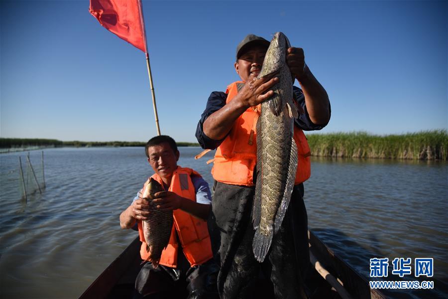 8月20日,在肇源县鲶鱼沟实业集团有限公司一分场,工作人员展示捕捞上来的鱼。 眼下正值鱼肥蟹美之时。近日,在黑龙江省大庆市肇源县鲶鱼沟实业集团有限公司一分场,工作人员平均每天可从水塘中捕捞鱼5000斤左右,河蟹1.2万斤左右。近年来,当地加大环境保护力度,对20万亩盐碱地进行改造,生态转好使鱼、蟹等资源得到恢复,带动当地百姓致富。 新华社记者 杨喆 摄