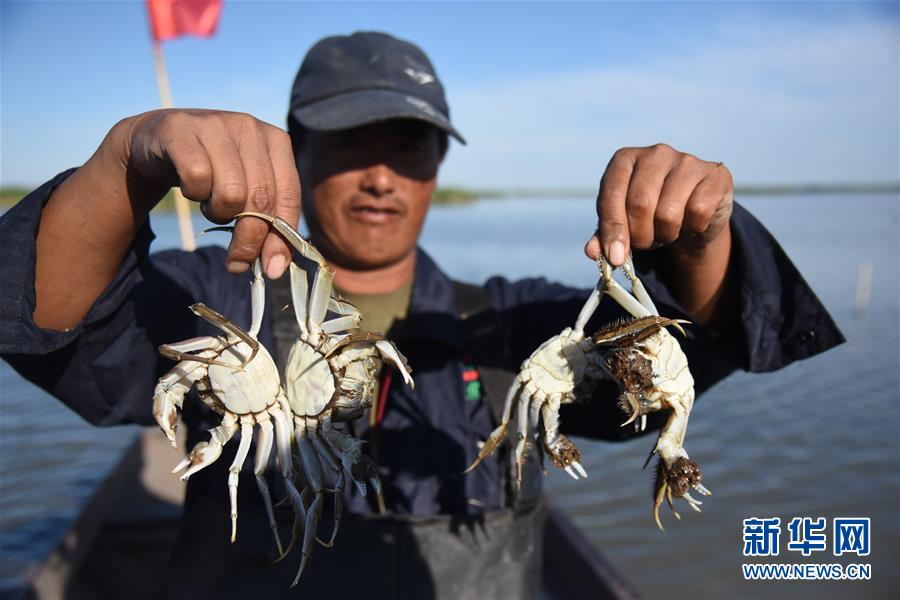 8月20日,肇源县鲶鱼沟实业集团有限公司一分场工作人员展示捕捞上来的河蟹。 眼下正值鱼肥蟹美之时。近日,在黑龙江省大庆市肇源县鲶鱼沟实业集团有限公司一分场,工作人员平均每天可从水塘中捕捞鱼5000斤左右,河蟹1.2万斤左右。近年来,当地加大环境保护力度,对20万亩盐碱地进行改造,生态转好使鱼、蟹等资源得到恢复,带动当地百姓致富。 新华社记者 杨喆 摄
