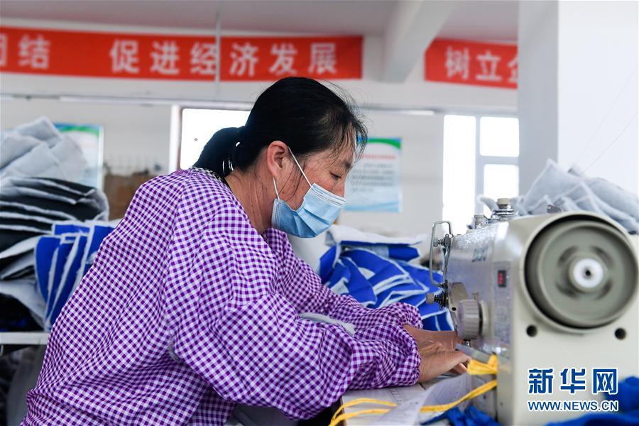 吉林省通榆县边昭镇村民在昭福家园的扶贫车间内缝制衣服(3月31日摄)。 新华社发(颜麟蕴 摄)