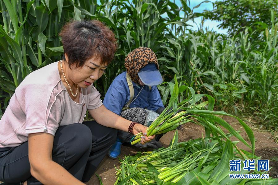 8月21日,在吉林省安石镇的农田里,李淑侠(左)与农民一起将采摘的乌米分等。 新华社记者 张楠 摄