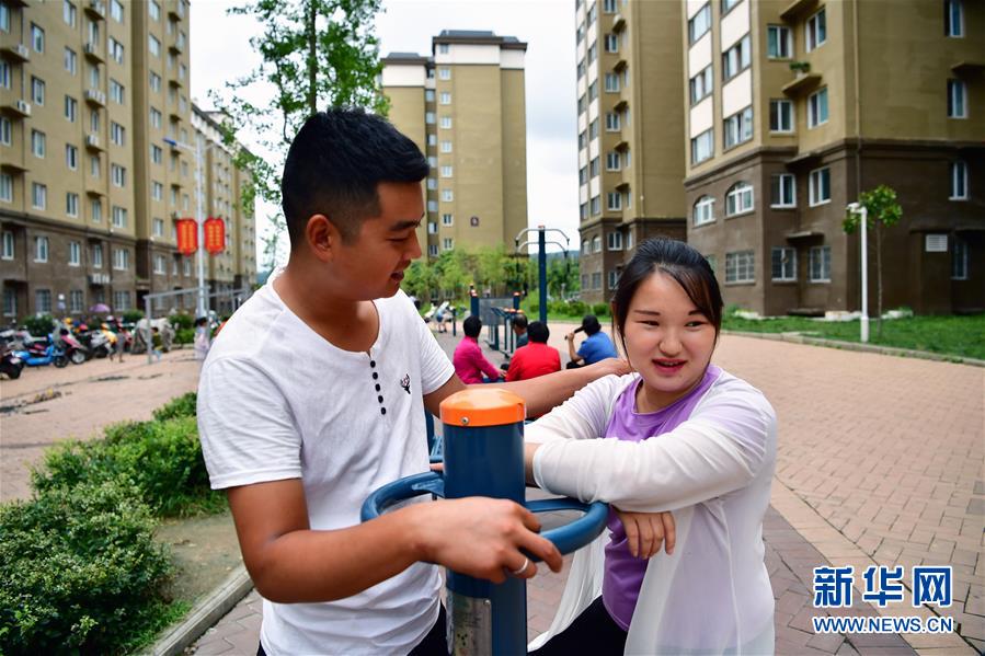 8月20日,在河南省三门峡市卢氏县河洛嘉园小区,王景峰陪着沈玉凤在健身广场休息。 新华社记者冯大鹏摄