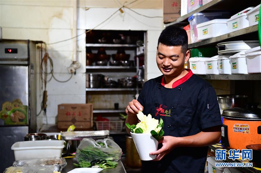 8月20日,在河南省三门峡市卢氏县一家火锅店,王景峰在配菜。 新华社记者冯大鹏摄