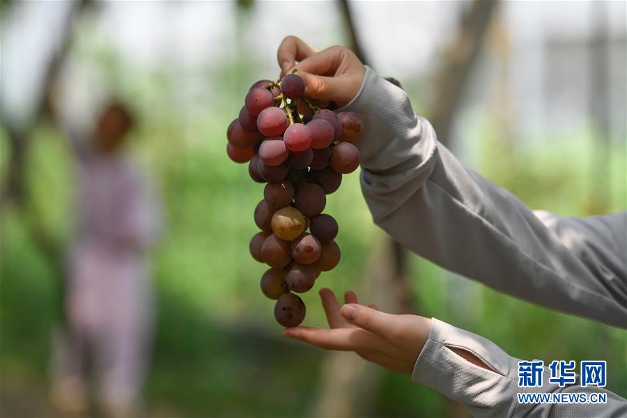 8月21日,游客在湖州市吴兴区八里店镇一家葡萄专业合作社的果园展示采摘的葡萄。 当日,浙江省湖州市吴兴区八里店镇在移沿山景区举办以“畅味丰收、律动八里”为主题的第三届葡萄丰收节,吸引游客前来体验采摘的乐趣。 新华社记者 黄宗治 摄