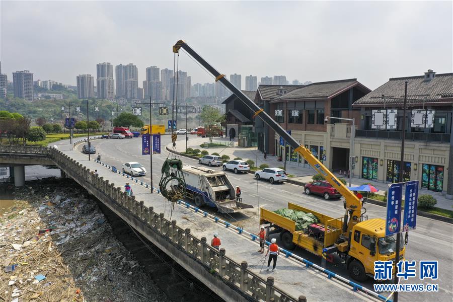 8月21日,重庆磁器口古镇旁的滨江道路上,环卫部门的大型工作车辆在进行清淤作业(无人机照片)。 在洪峰顺利通过重庆中心城区后,长江、嘉陵江水位持续回落。重庆磁器口千年古镇积极开展灾后恢复工作。当地组织环卫工人、城管队员及志愿者与受灾商户、居民一起开展清淤、消杀、房屋安全检查及复工复产相关工作。 新华社记者 刘潺 摄