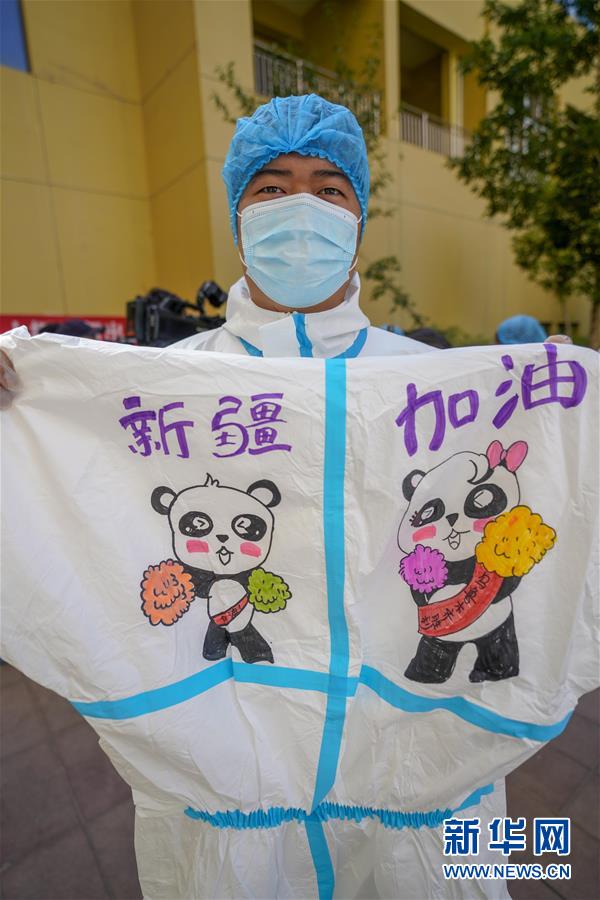 8月21日,在乌鲁木齐经济技术开发区(头屯河区)澎湖路一小区内,志愿者展示自己领到的“纪念版手绘防护服”。 连日来,乌鲁木齐经济技术开发区(头屯河区)组织的“网上点赞志愿者活动”得到广大居民的积极响应。目前,这个辖区共有党员干部、共青团员、退役军人、普通群众等1.55万余名志愿者参与志愿服务,他们投身便民生活代办、困难群体照料、防疫知识宣传和心理辅导等具体工作中,为疫情防控贡献力量。 新华社记者 赵戈 摄