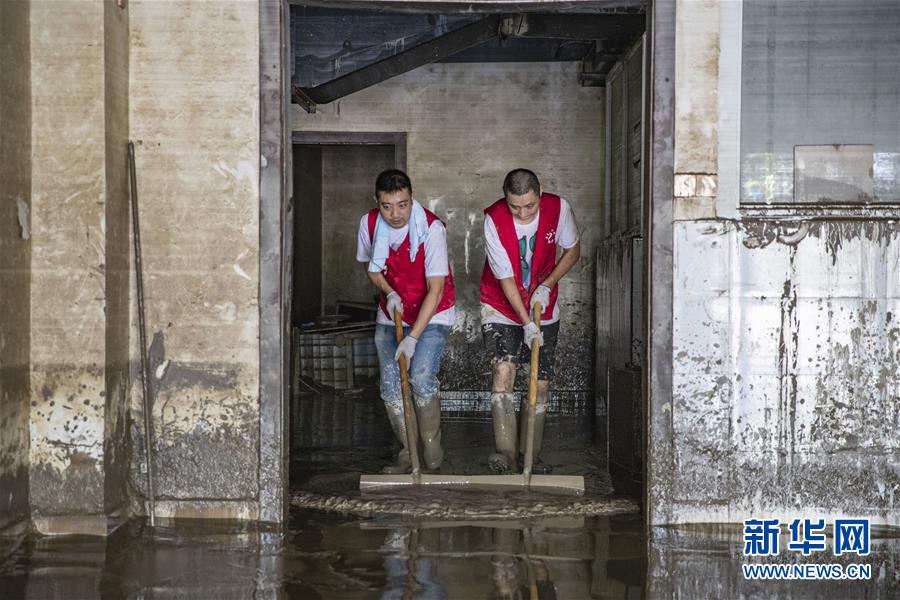 8月21日,在重庆市潼南区大佛寺景区,志愿者在清理室内的淤泥。 当日,涪江重庆潼南段水位开始逐渐回落。当地相关部门组织开展清淤、消杀等工作,帮助群众尽快恢复正常生产生活秩序。 新华社记者 黄伟 摄