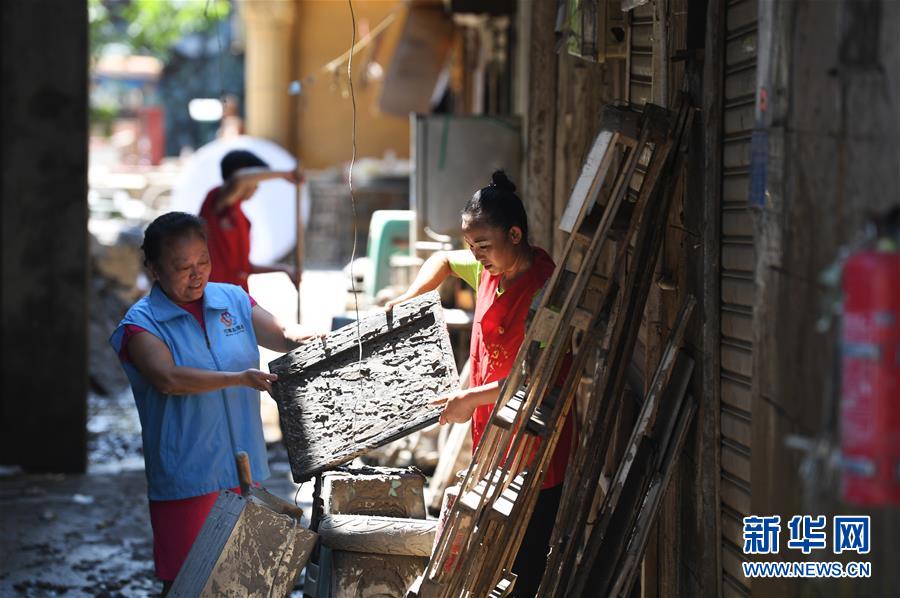 8月23日,志愿者在江北区郭家沱街道锣旗寺社区进行清淤作业。 洪峰过去,受灾较为严重的重庆市江北区郭家沱街道在党员干部、社区志愿者、清洁工人等多股力量的齐心协力下,积极开展清淤消杀等灾后恢复重建工作。 新华社记者 王全超 摄