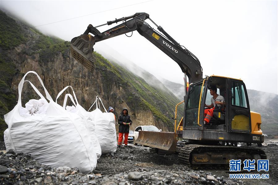 8月23日,抢险人员在舟曲县曲告纳镇境内被冲毁的铁坝河1号桥旁开展道路抢通作业。 新华社记者 郎兵兵 摄
