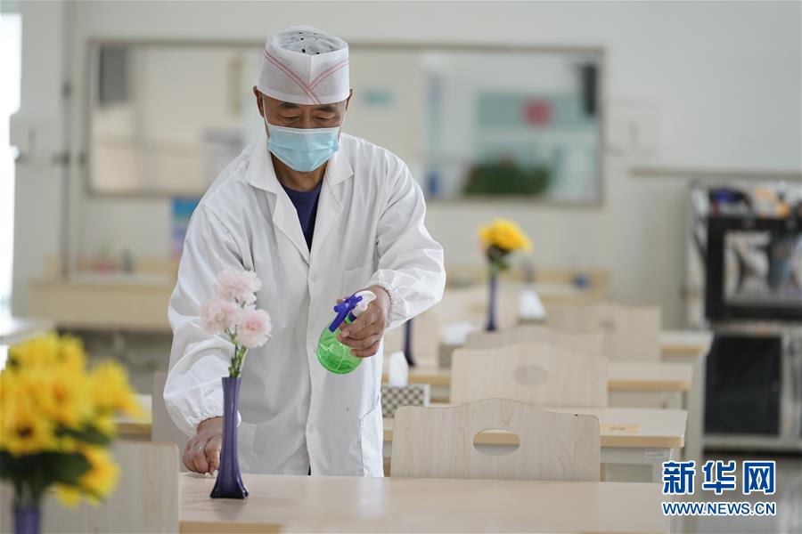 8月24日,在北京教育学院附属丰台实验学校食堂,工作人员对桌椅进行消毒。 开学前夕,北京教育学院附属丰台实验学校以一米线、地贴等为分隔线,为学生设计适当的活动空间,从人员、防疫和教学等方面,做好秋季学期教育教学和疫情防控准备工作。 新华社记者 邢广利 摄