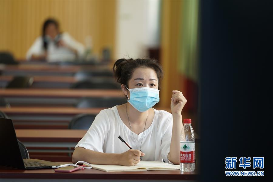 8月24日,北京教育学院附属丰台实验学校的老师在参加相关培训。 开学前夕,北京教育学院附属丰台实验学校以一米线、地贴等为分隔线,为学生设计适当的活动空间,从人员、防疫和教学等方面,做好秋季学期教育教学和疫情防控准备工作。 新华社记者 邢广利 摄