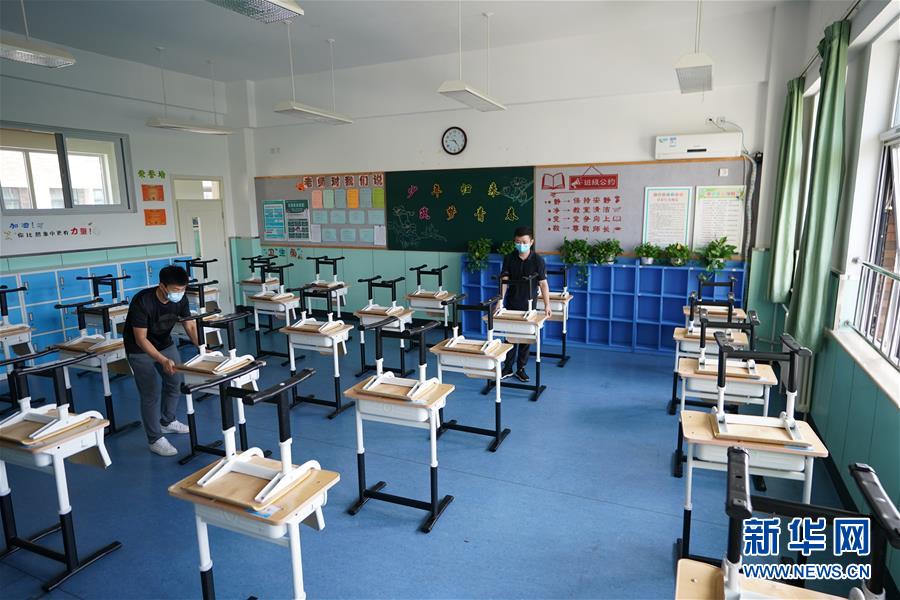 8月24日,北京教育学院附属丰台实验学校的老师在摆放课桌。 开学前夕,北京教育学院附属丰台实验学校以一米线、地贴等为分隔线,为学生设计适当的活动空间,从人员、防疫和教学等方面,做好秋季学期教育教学和疫情防控准备工作。 新华社记者 邢广利 摄