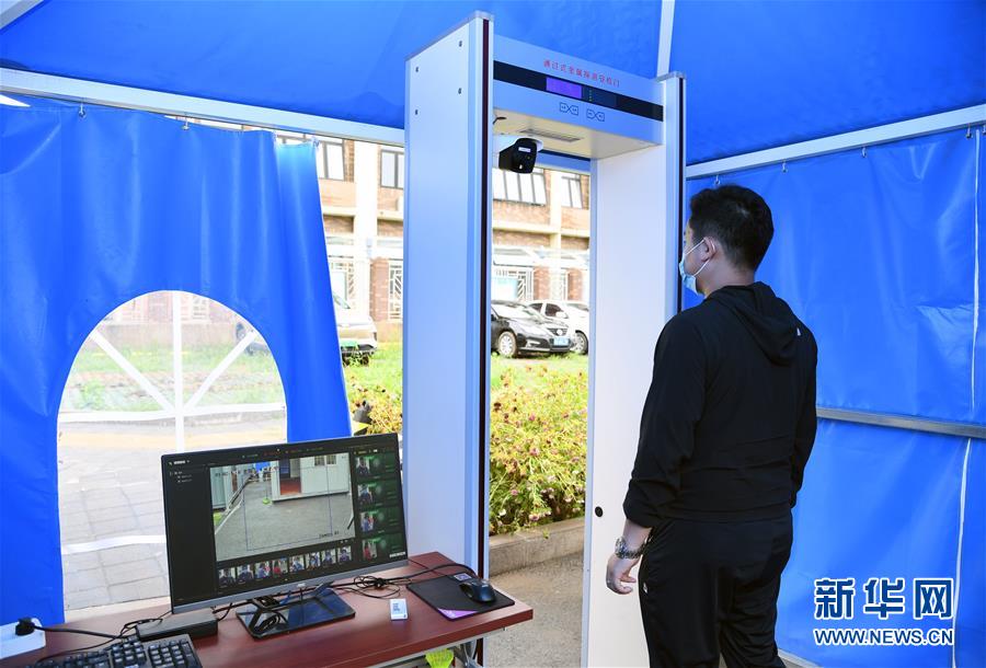 8月24日,北京教育学院附属丰台实验学校职工在测试校门口设置的学生测温区。 开学前夕,北京教育学院附属丰台实验学校以一米线、地贴等为分隔线,为学生设计适当的活动空间,从人员、防疫和教学等方面,做好秋季学期教育教学和疫情防控准备工作。 新华社记者 任超 摄