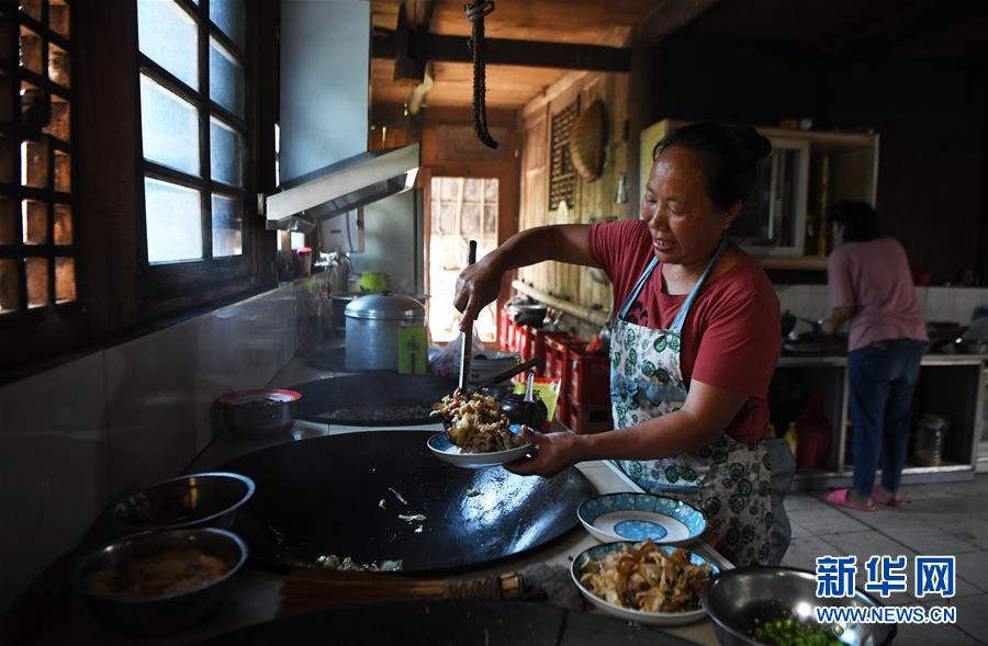 重庆市彭水苗族土家族自治县鞍子镇罗家坨苗寨一户农家乐的工作人员在厨房盛菜(8月13日摄)。新华社记者 王全超 摄