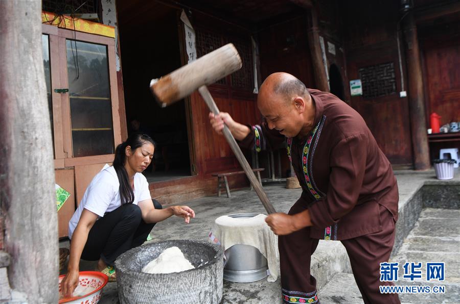 重庆市彭水苗族土家族自治县鞍子镇罗家坨苗寨一户农家乐的工作人员在制作糍粑(8月13日摄)。新华社记者 王全超 摄