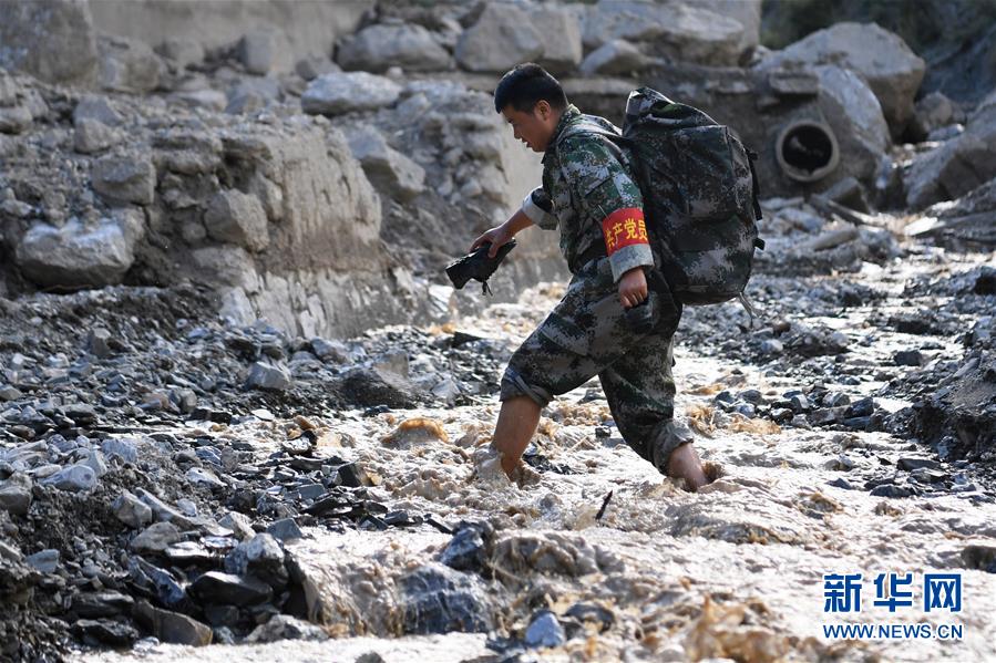 一名抢险救灾党员突击队队员前往受灾严重的舟曲县曲告纳镇莫诺村途中通过涉水路段(8月24日摄)。新华社记者 陈斌 摄