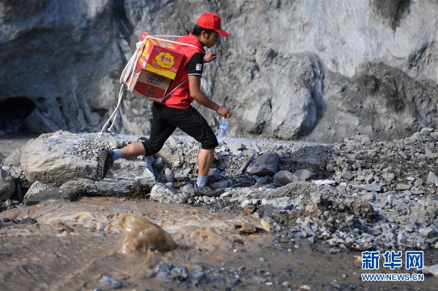 志愿者牟世华在前往受灾严重区域途中跨过水毁路面(8月24日摄)。 新华社记者 陈斌 摄