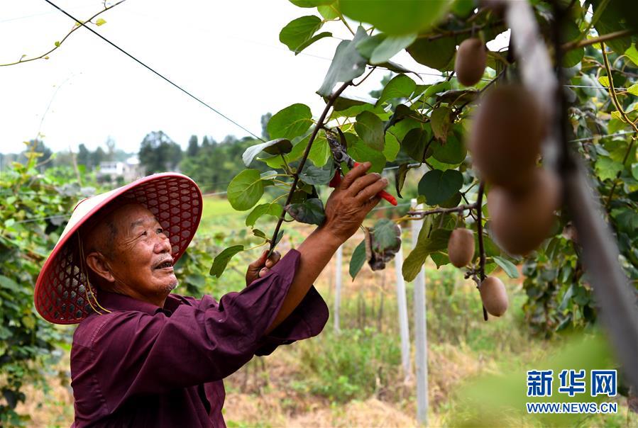 8月25日,在光山县文殊乡东岳村,村民在猕猴桃种植园内修剪树枝。 新华社记者 郝源 摄