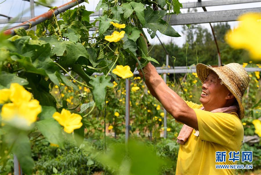 8月25日,在光山县文殊乡东岳村,村民在采摘丝瓜。 新华社记者 郝源 摄