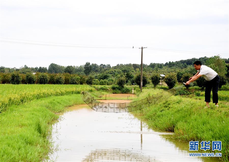 8月25日,在光山县文殊乡东岳村,村民在下网笼抓小龙虾。 新华社记者 郝源 摄