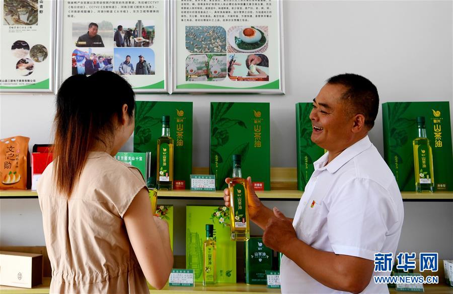 8月25日,在光山县文殊乡东岳村电子商务示范站,工作人员(右)向游客介绍当地山茶油。 新华社记者 郝源 摄