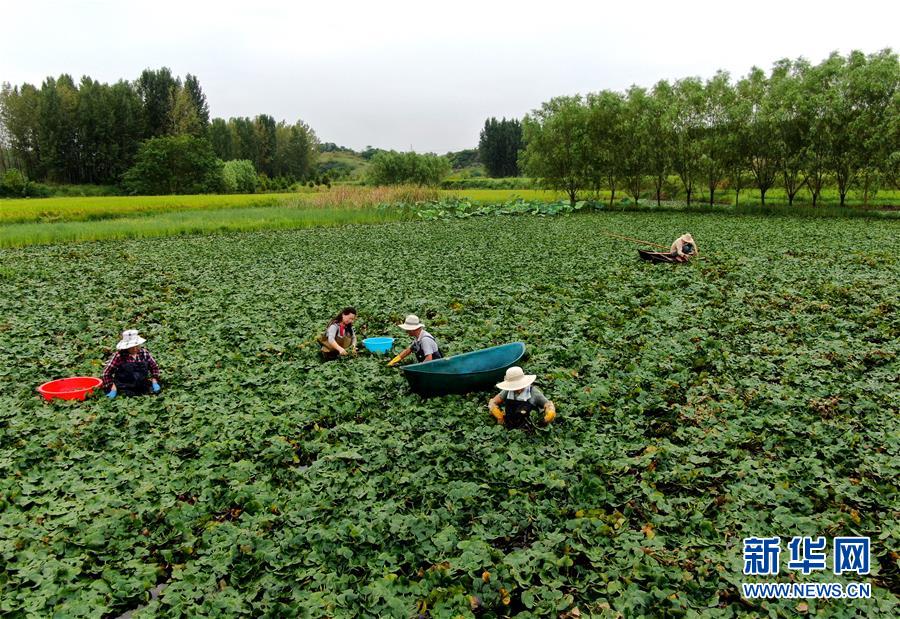 8月25日,在光山县槐店乡珠山村,升辉合作社社员在水中采摘菱角(无人机照片)。 时下,河南省光山县槐店乡种植的菱角陆续进入收获季,村民忙着下塘采摘菱角,成为豫南地区独有的丰收图景。近年来,当地按照“党支部+合作社+农户”模式,引导村民标准化、规模化种植菱角,种菱户户均年增收2万多元。 新华社记者郝源摄