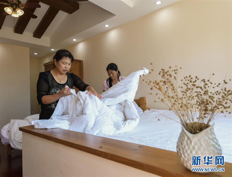 8月27日,服务人员在茴菜梁村“天路——张成家民宿”内整理客房。新华社记者 李贺 摄