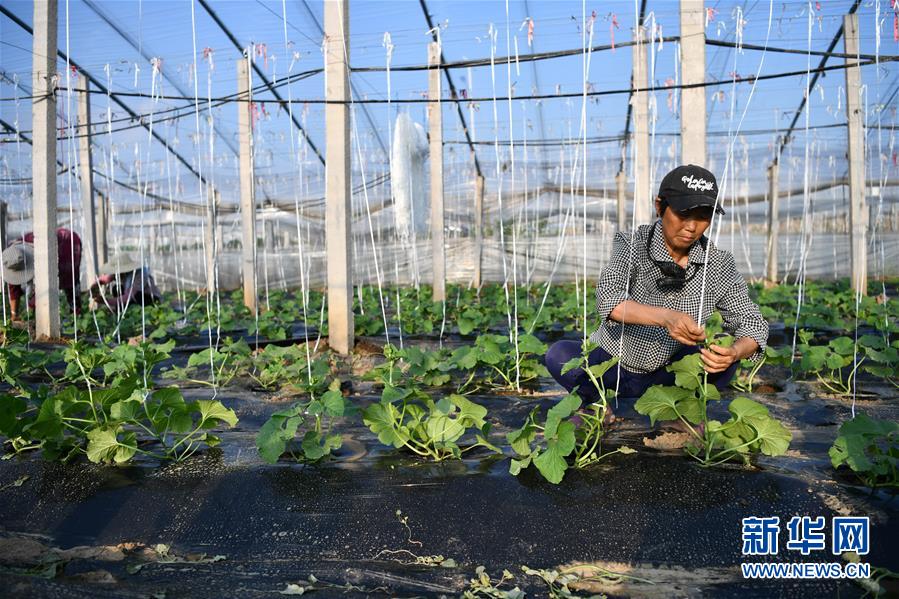 8月27日,在凤阳县刘府镇金丰种植合作社果蔬扶贫基地,村民在甜瓜棚内劳作。 新华社记者 刘军喜 摄