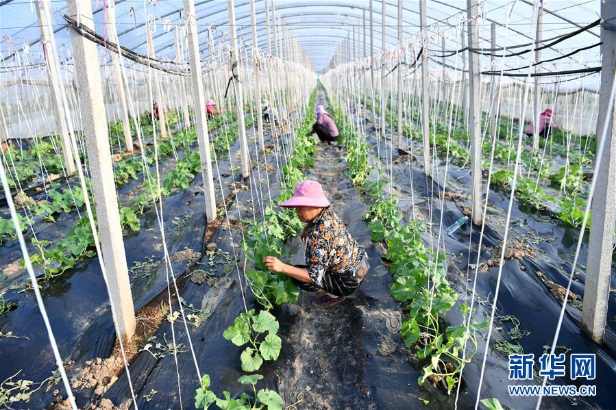 8月27日,在凤阳县刘府镇金丰种植合作社果蔬扶贫基地,村民在甜瓜棚内劳作。 新华社发(蒋彤 摄)