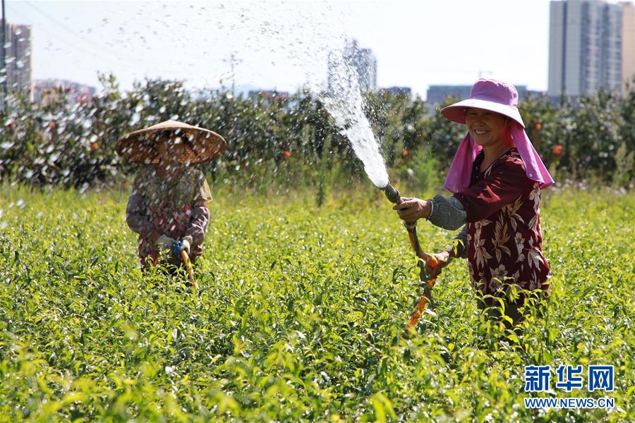 8月27日,搬迁群众在余庆县东部产城易地扶贫搬迁安置点的苦丁茶育苗基地内浇水。 新华社记者 刘续 摄
