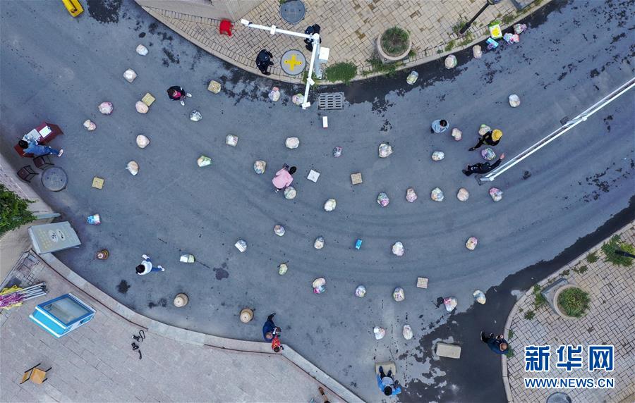 空中花园小区临时党小组的成员将帮助居民购买的物品按序摆好,方便下楼散步的小区居民寻找(8月26日无人机拍摄)。