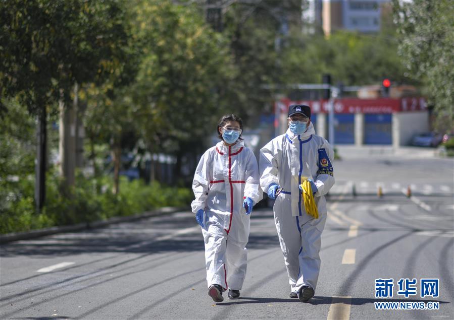 盛筱榆(左)、谷新波行走在辖区内一条街道上(8月15日摄)。 新华社记者 赵戈 摄